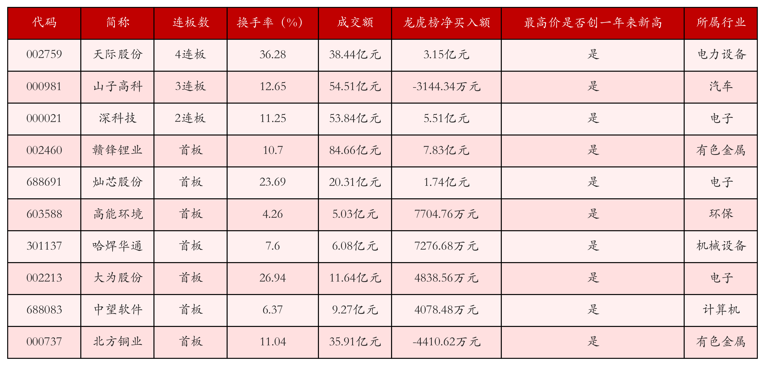截至10月9日收盘,上证综指上涨1.32%,收于3933.97点,深证成指上涨1.47%,收于13725.56点,创业板指上涨0.73%,收于3261.82点。今日沪深两市A股共计98只涨停,综合当前连板数以及当日龙虎榜数据,其中较为强势的前三只个股分别为:天际股份(002759)、山子高科(000981)与深科技(000021)。今日强势个股前10位具体数据见下表: