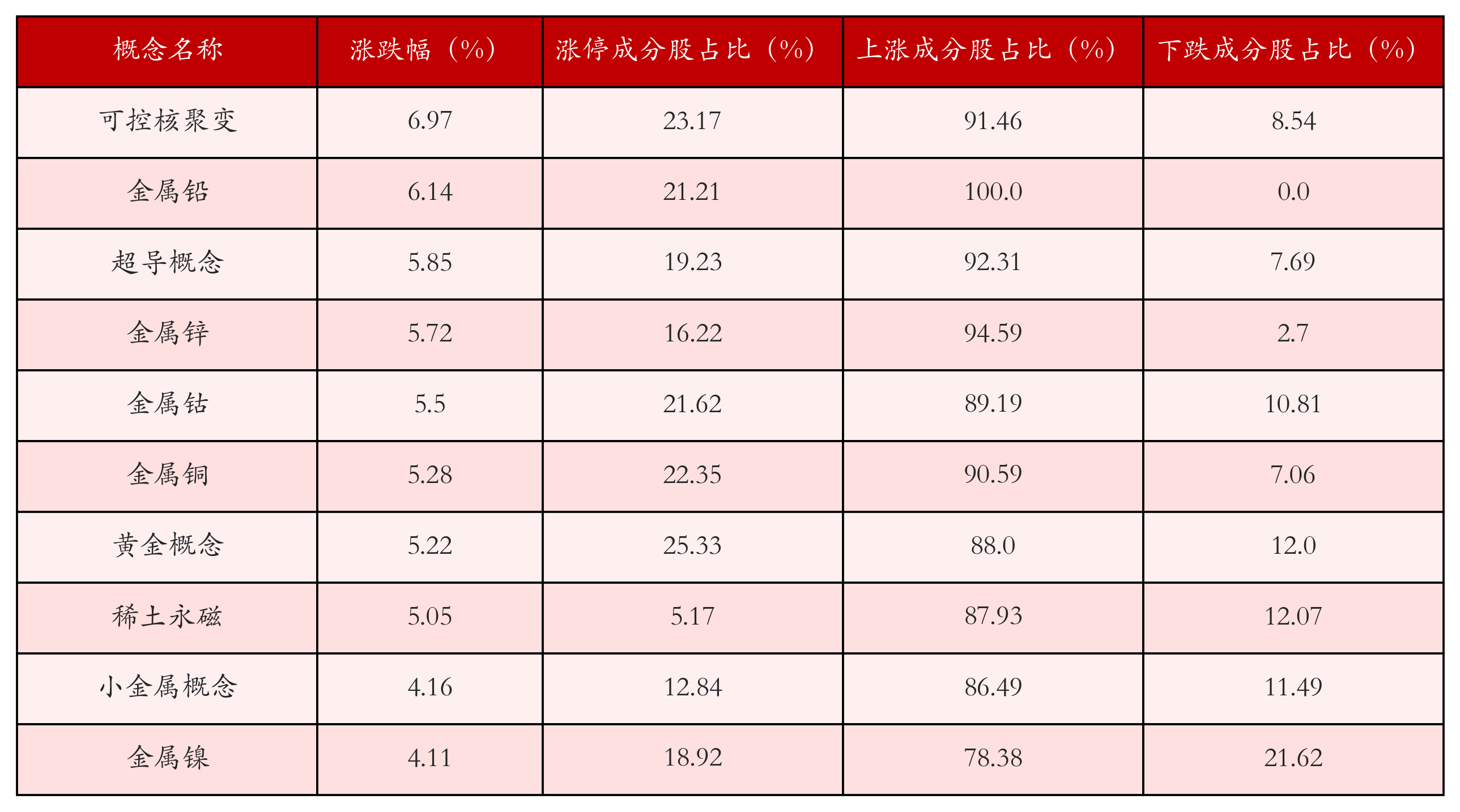 根据A股概念涨跌幅与所对应的股票池综合分析,涨幅靠前的三个概念板块分别为:可控核聚变、金属铅与超导概念。排名前10位的概念板块相关数据见下表: